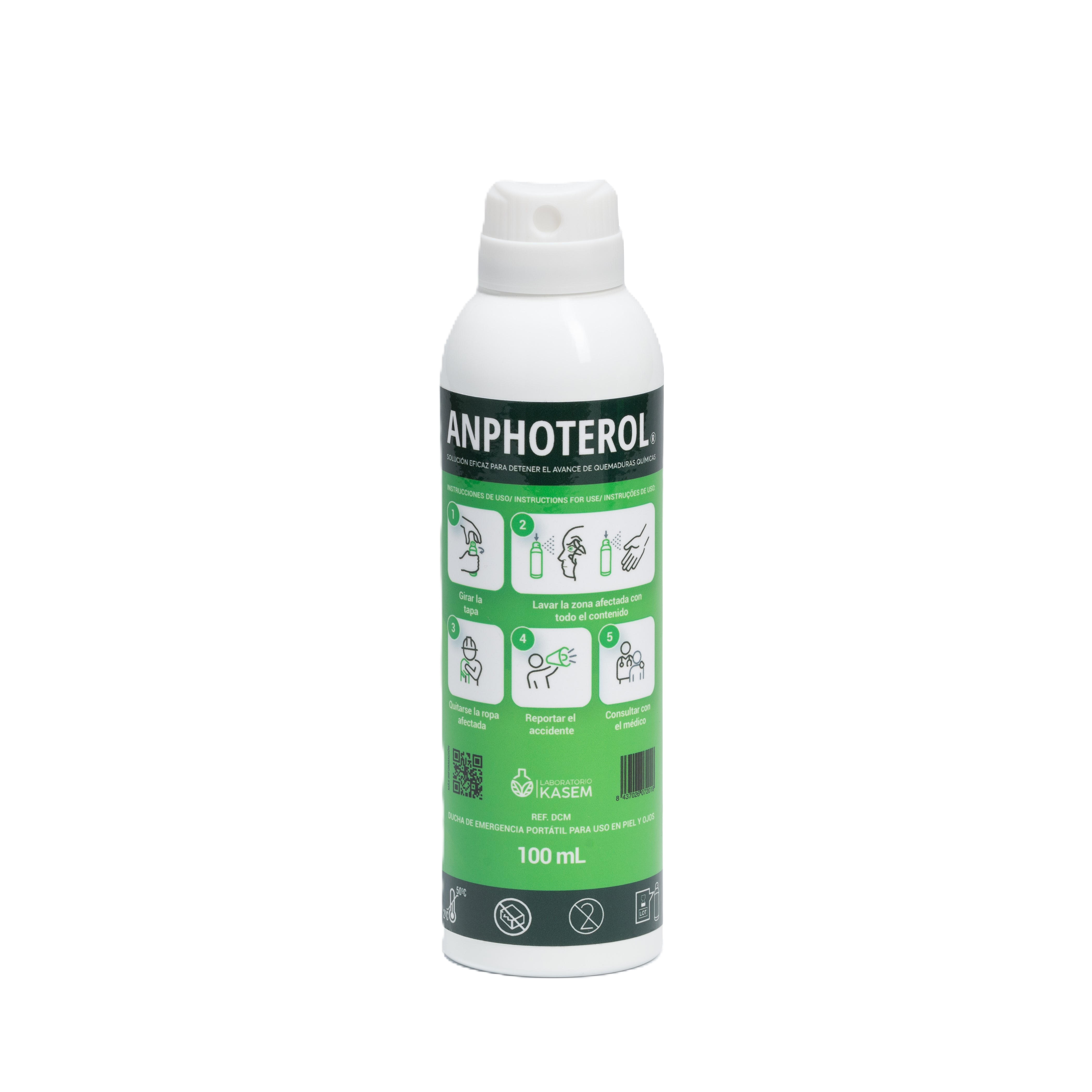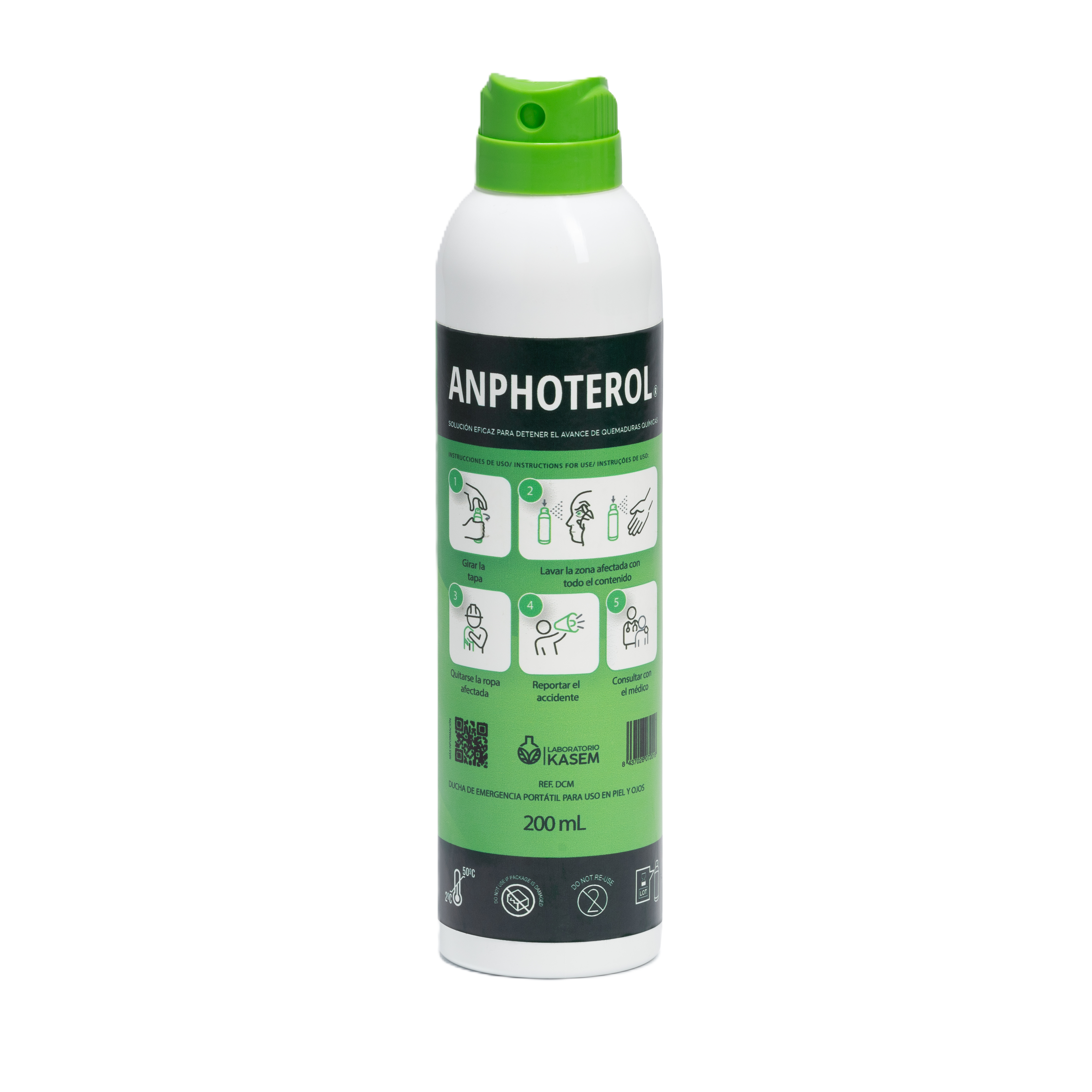 Descontaminador nebulizado para piel y ojos de uso hasta un 9% de superficie corporal en caso de accidentes por salpicadura de agentes acido-base, oxidantes-reductores y corrosivos-irritantes. Producto no irritante, no alérgico, biodegradable y no tóxico.